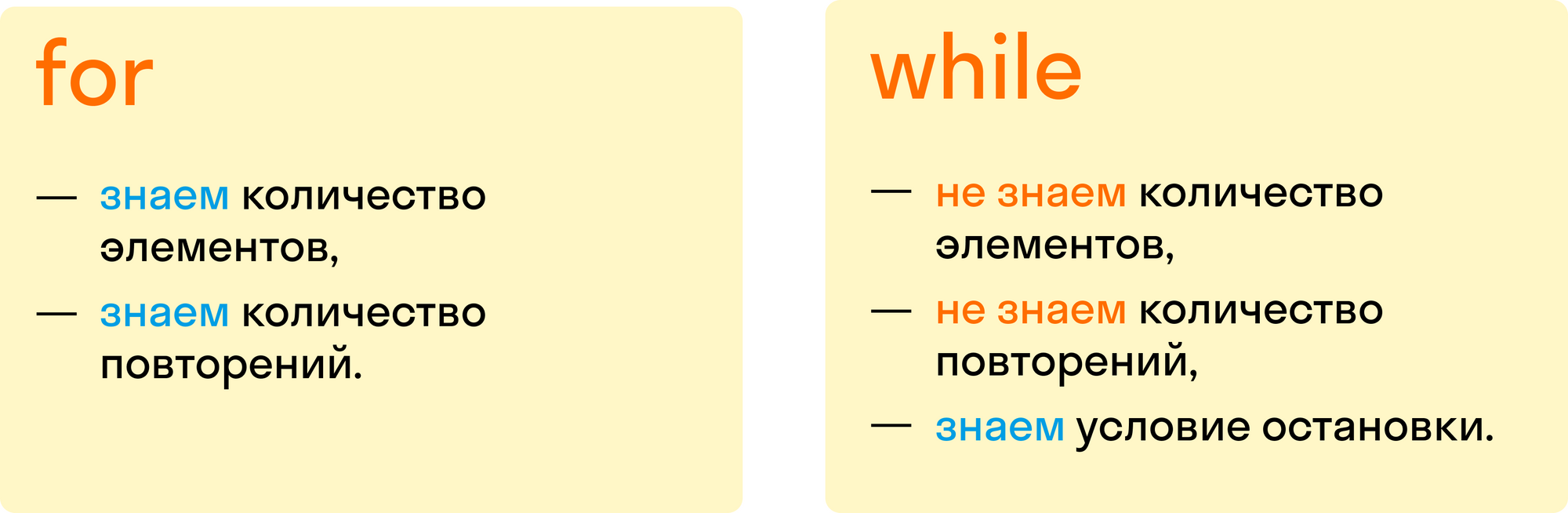 Цикл — это конструкция из оператора, условия и блока.