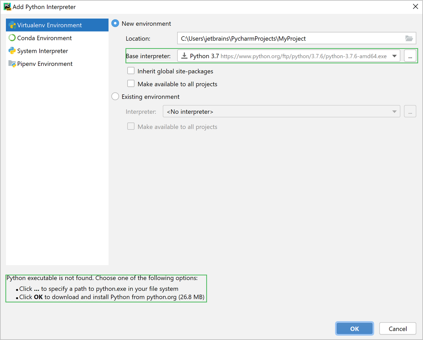 Поставьте первую галочку Inherit global site-packages, если хотите, чтобы глобально установленные пакеты были доступны в этом виртуальном окружении (рекомендуем не ставить).