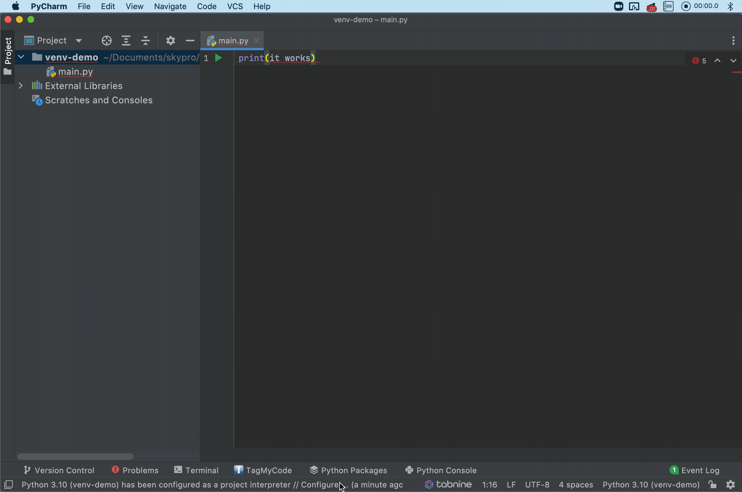 Внизу, в терминале, мы видим «Hello, PyCharm». Это значит, что наш код был выполнен интерпретатором Python.