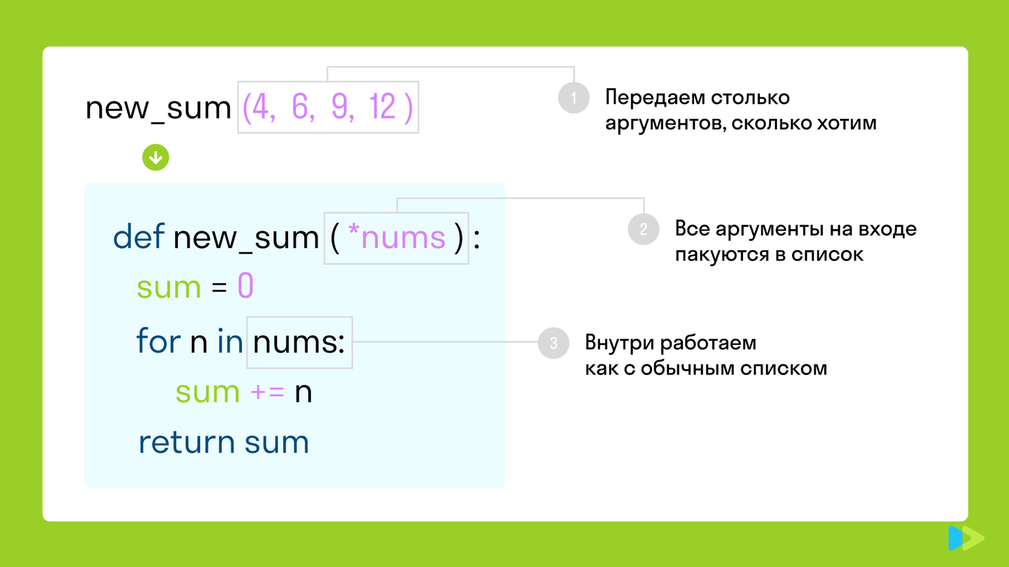 Мы можем принимать любое количество аргументов, если при попадании внутрь функции они превращаются в список. Внутрь функции можно передавать объекты любого типа.