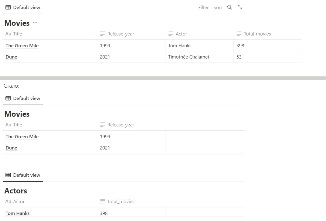 Нормальная форма — требования, которые должна выполнять БД, чтобы свести к минимуму ошибки в результатах выборки или изменения данных. 1. Не должно быть наборов значений в одной строке. Было: