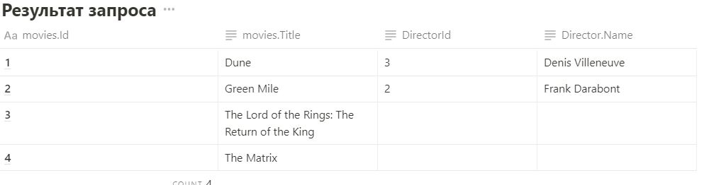 LEFT JOIN directors ON movies.DirectorId = directors.Id