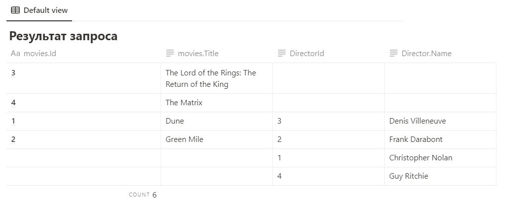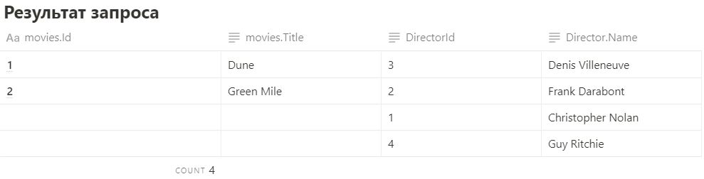 OUTER JOIN directors ON movies.DirectorId = directors.Id