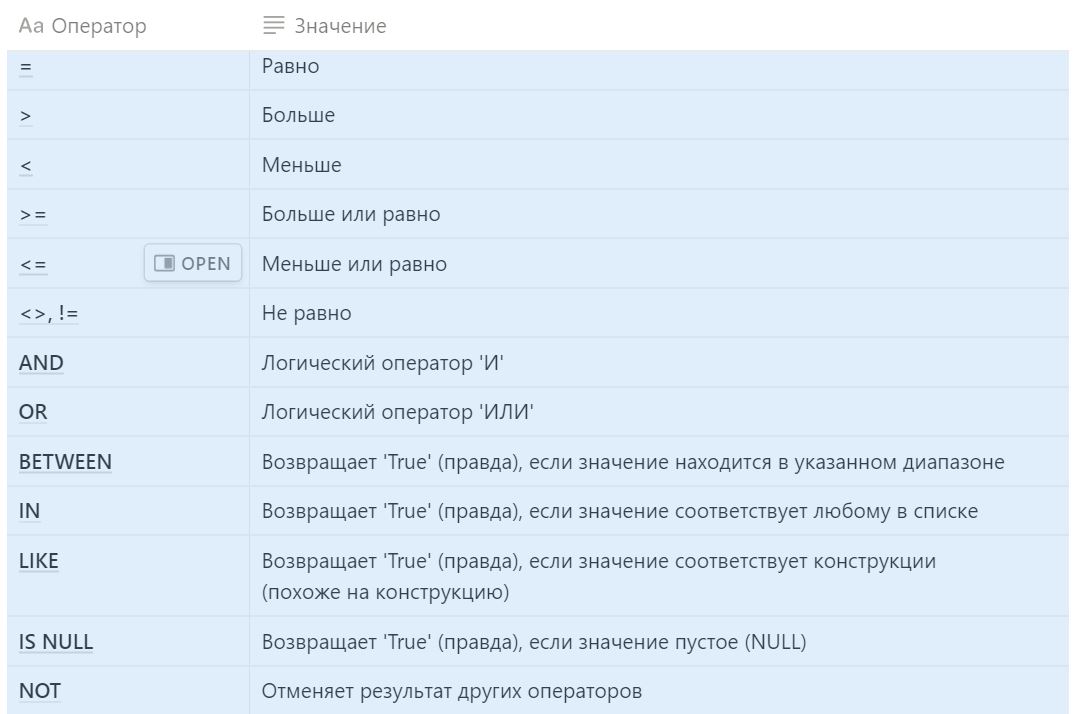 Двойные кавычки — в начале и конце запроса, одинарные — там, где мы ищем строковое значение. Для ключевого слова WHERE существует несколько **операторов** условий.